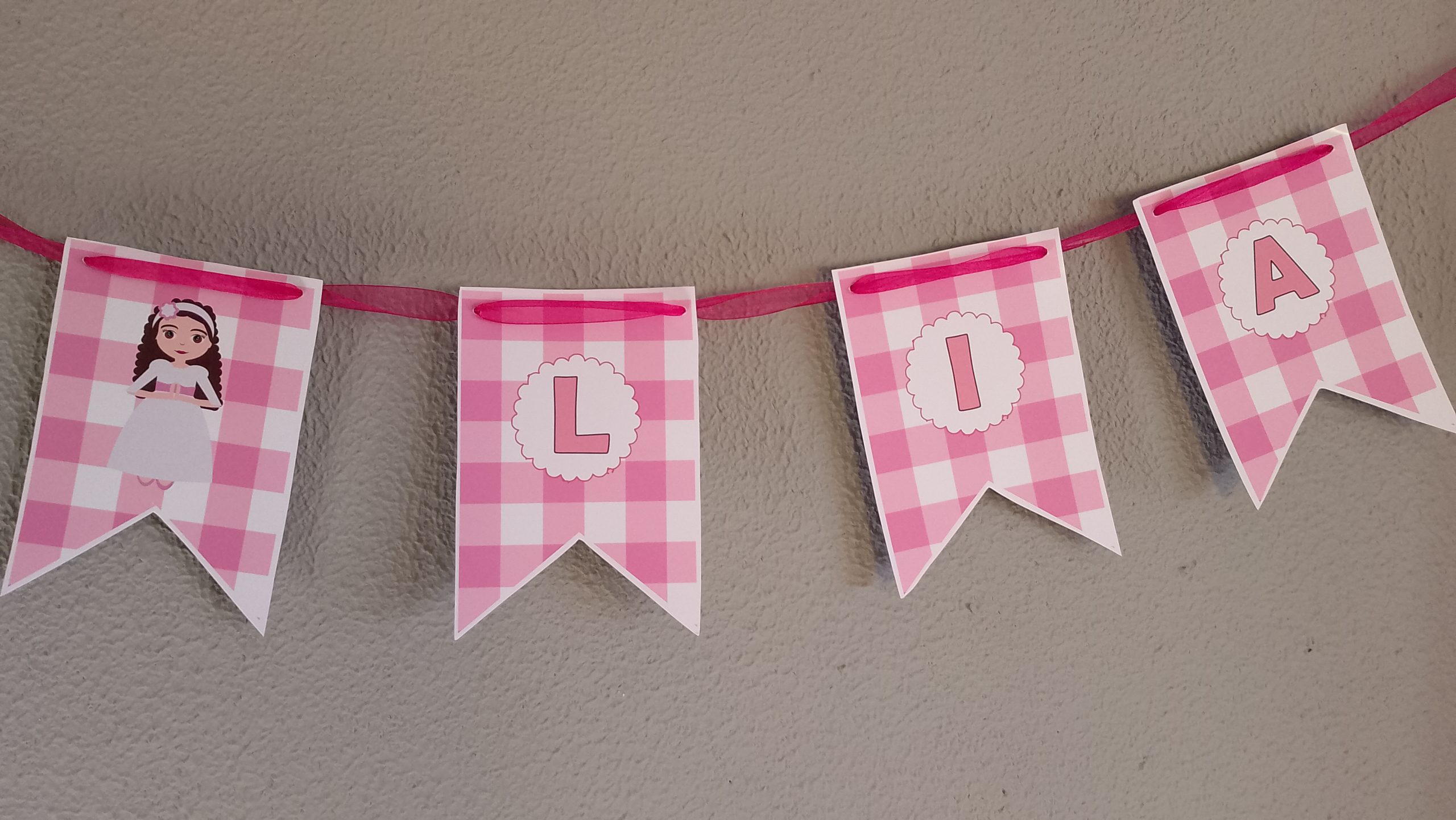 Disponemos de Banderines personalizados con nombre para la comunión de tu hij@, ideal para decorar la mesa dulce o el lugar de celebración.