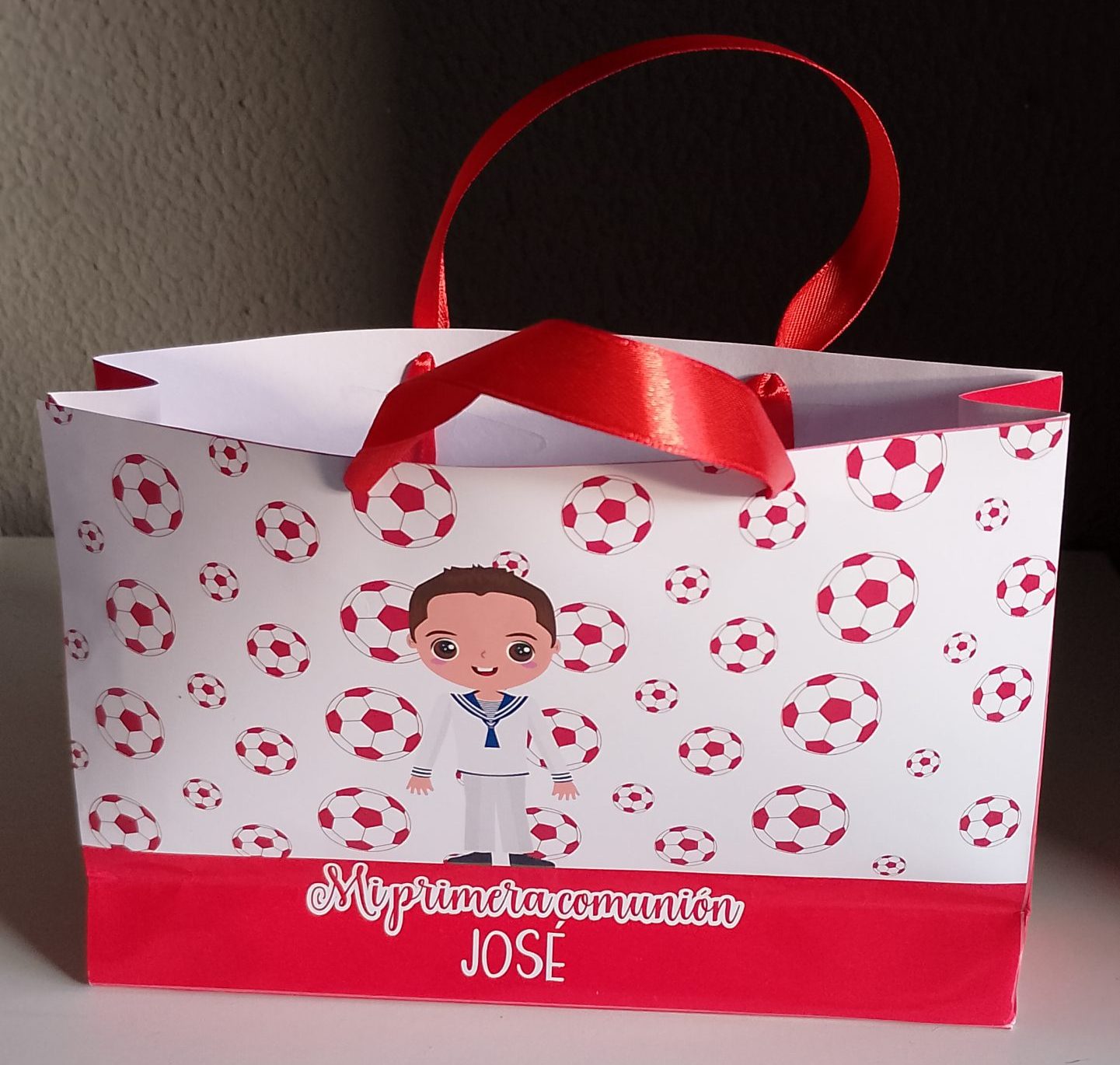 – Bolsa de papel impresa en papel fotografico brillo con asas de cinta de raso.