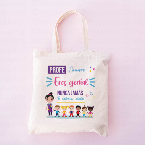 - Esta bolsa tiene modelo «Profe [Nombre], eres genial, nunca jamás, te podremos olvidar» pudiendo personalizar el nombre del profesor/a.