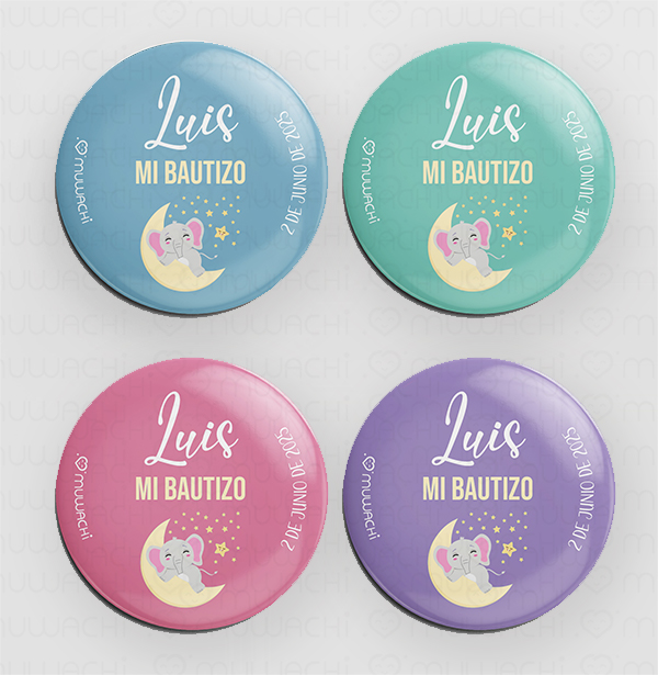 • Chapas personalizadas con la información del evento (Nombre del niño y fecha) y selección del color entre los disponibles.