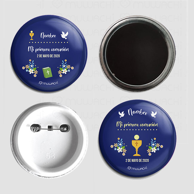 Sorprende a tus invitados y celebra la Primera Comunión con nuestra exclusiva Chapa comunión con nombre floral, el regalo perfecto como detalle del evento. Cada chapa incluye el nombre del niño y ideal como recuerdo único y significativo para los invitados. Disponible en formato alfiler o imán (ideal para nevera). Pedido mínimo 10 unidades.