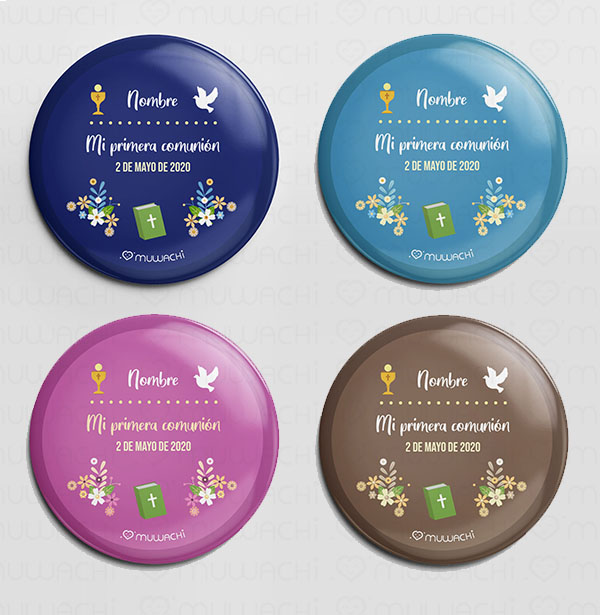 - Chapas personalizadas con la información del evento (Nombre del niño y fecha) y selección del color entre los disponibles.