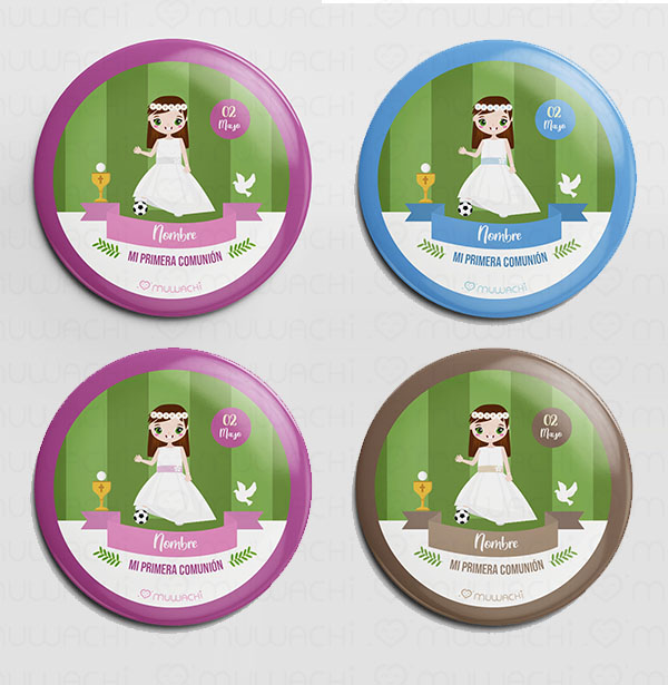 - Chapas personalizadas con la información del evento (Nombre del niño y fecha) y selección del color entre los disponibles.