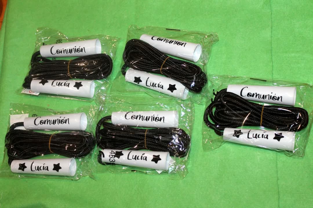 Celebras un bautizo, boda o comunión y no sabes que regalar a los niñ@s? Te ofrecemos una comba con el nombre personalizado de cada niño. Varios colores. Pedido mínimo 10 unidades.