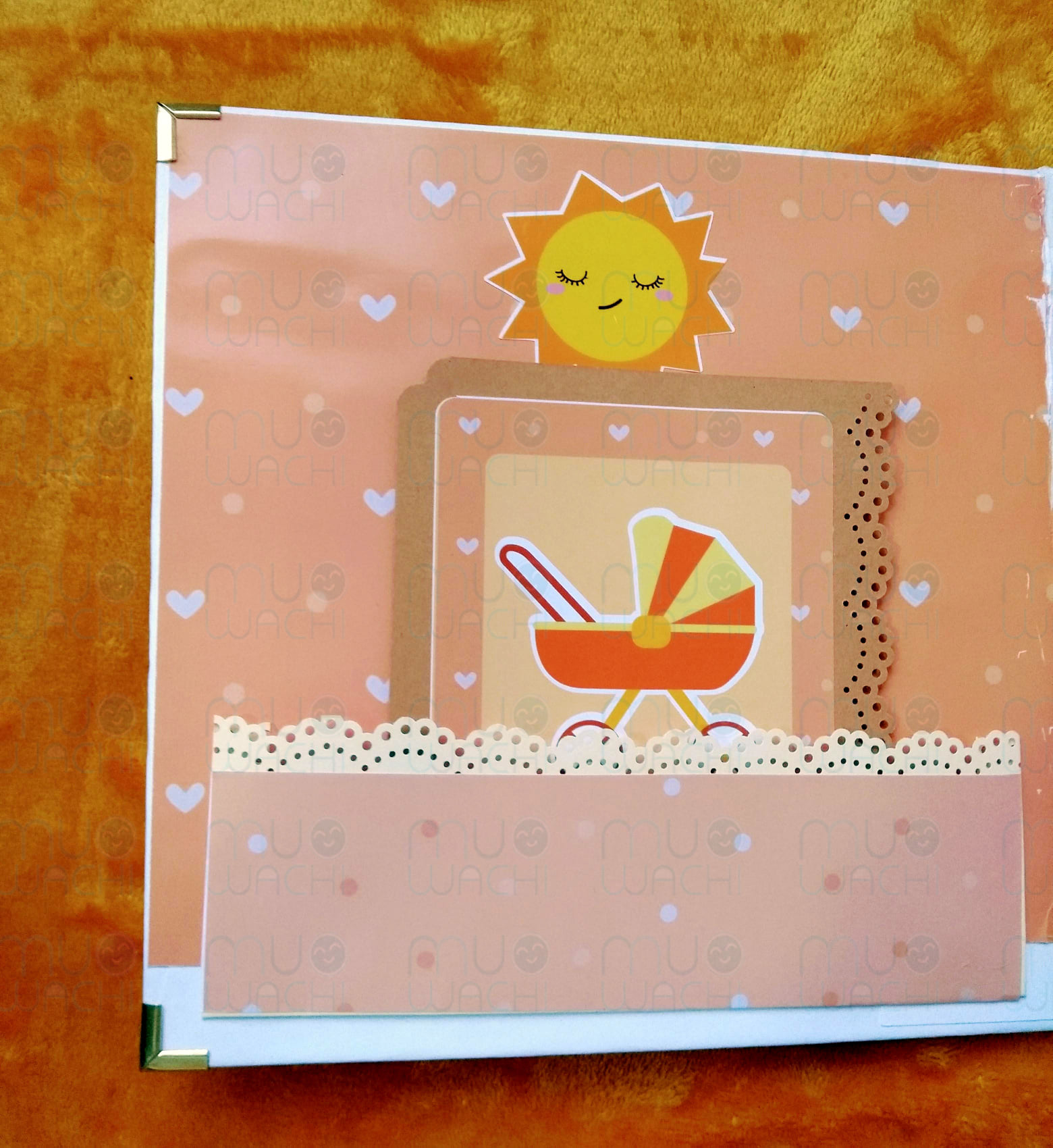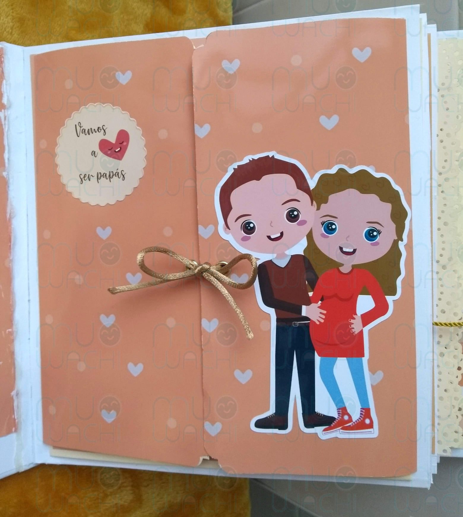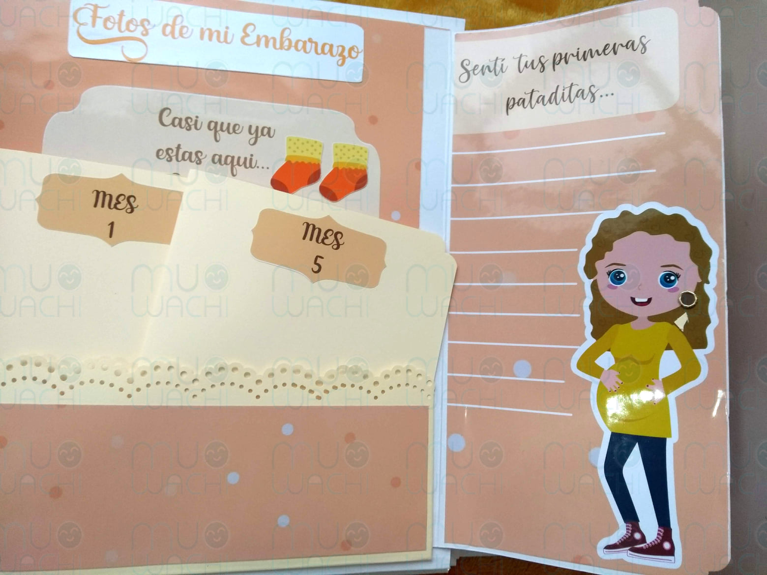 – Se trata de un álbum de fotos personalizado con desplegables y tarjetones ideales para recordar tanto el embarazo, como el primer año de tu bebé.