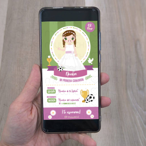 Características de la Invitación Primera comunión digital personalizada fútbol niña