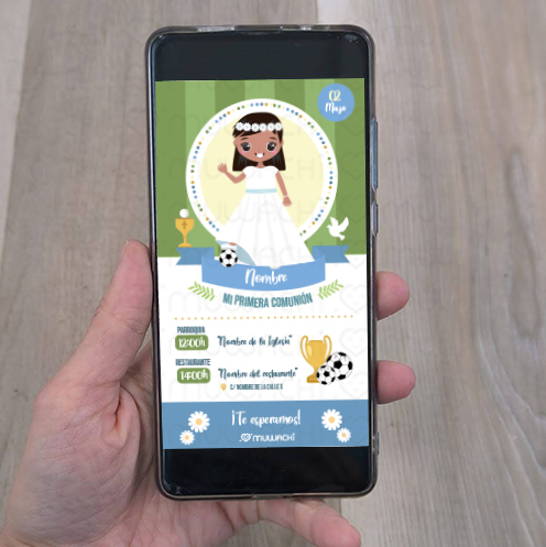 Haz que la primera comunión sea inolvidable con nuestra Invitación Primera comunión digital personalizada fútbol niña. Diseñada especialmente para celebrar este día tan especial, esta invitación combina elegancia, creatividad y tecnología. Incluye un avatar personalizable eligiendo el color y tipo de pelo, color de ojos y piel del niño o niña. Personaliza el modelo y color del traje o vestido para un toque aún más especial.