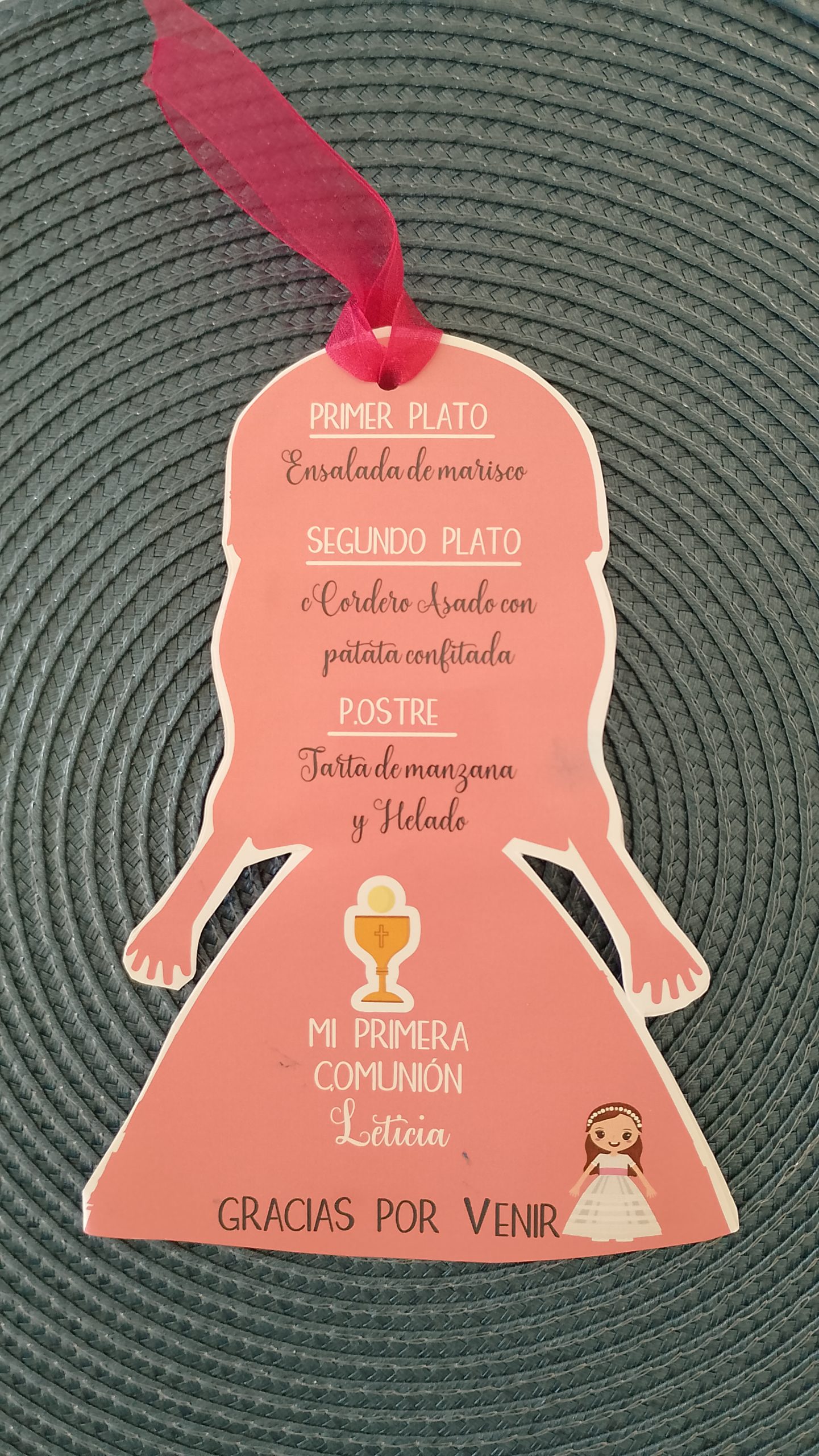 • La cara delantera aparece la silueta del muñeco con el nombre del invitado y en la parte posterior la silueta a un color a elegir, y el menú de la comunión.