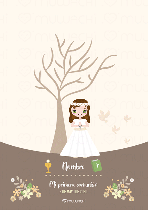¡Espectacular y emocionante Lámina Comunión Huellas y Firmas Niña – Modelo floral! Crea un recuerdo inolvidable con nuestro avatar personalizable: elige el tipo y color de pelo, color de ojos y piel, estilo de traje y su color. Añade el nombre del niño para un toque personal exclusivo.