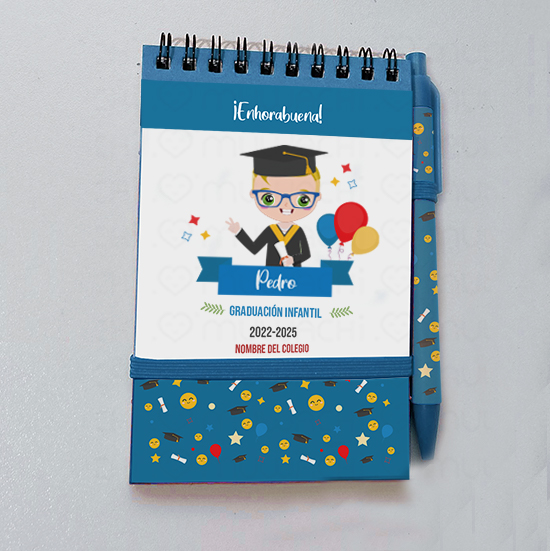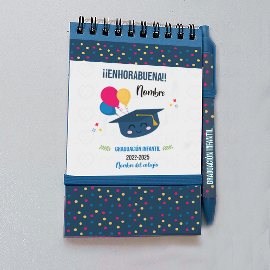 Si buscas un regalo personalizado para los niños que se gradúan, te ofrecemos una Libreta personalizada para graduación con el nombre del niño/a o totalmente personalizada con opción de seleccionar tipo y color de pelo, color de piel y color de ojos. Libreta de material ecológico con bolígrafo incluido y diseño alegre. Además, incluye el nombre de manera individual.