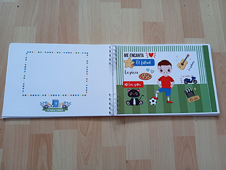 • de papel fotográfico 210grs mate (por delante y detrás 4 hojas en total), decoradas para poner fotos.