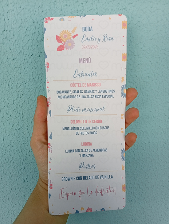 Minuta de Boda personalizada Flores – Colección Jardín Pastel