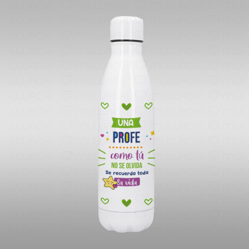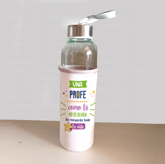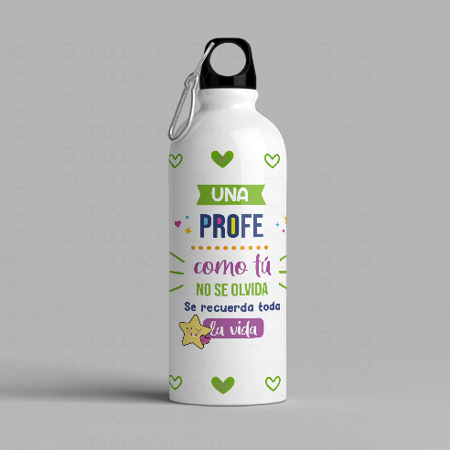 - Contiene bolsa de tela personalizada con nombre modelo «Un/a profe como tú no se olvida, se recuerda toda la vida» + Botella a juego con opción de añadir nombre.