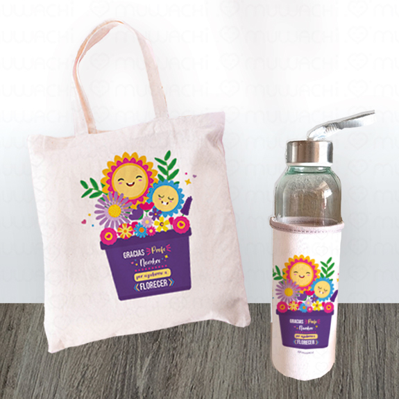 • Contiene bolsa de tela personalizada con nombre modelo «Gracias profe [Nombre] por ayudarnos a florecer» + Botella termo a juego con opción de añadir nombre.
