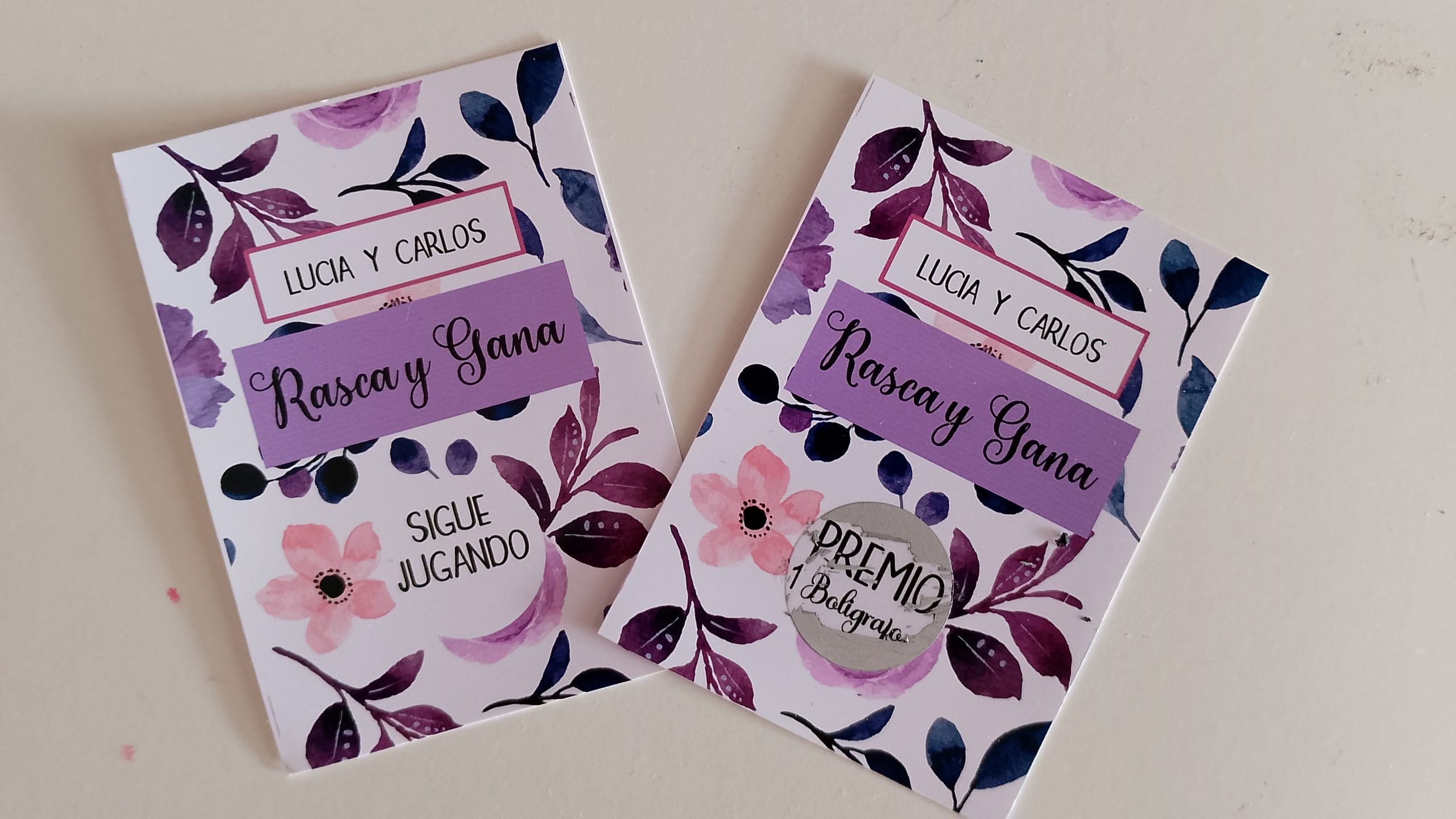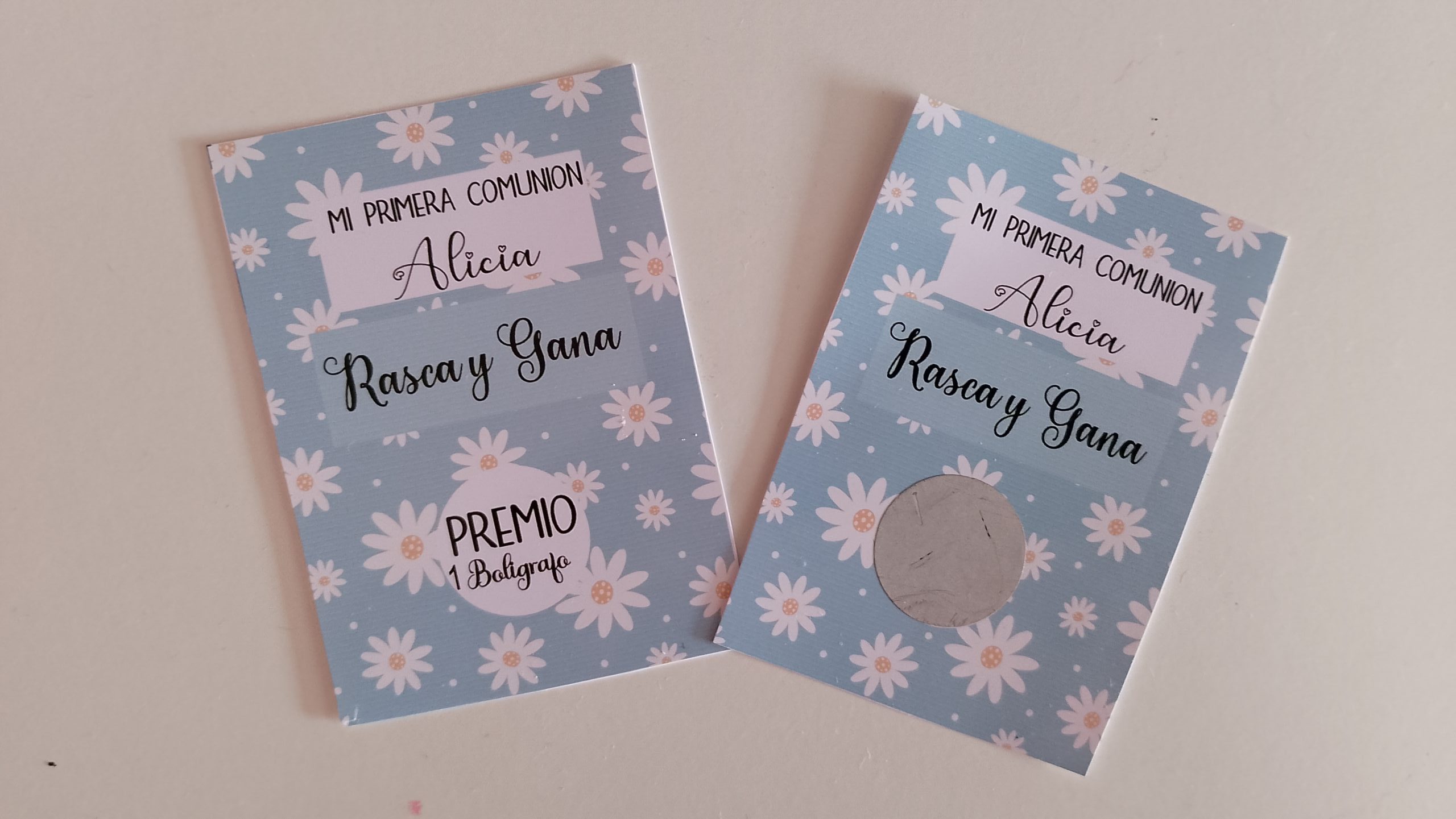 - El tamaño de cada tarjeta rasca es 6,6 x 9,4cm y está impresa a 1 cara.