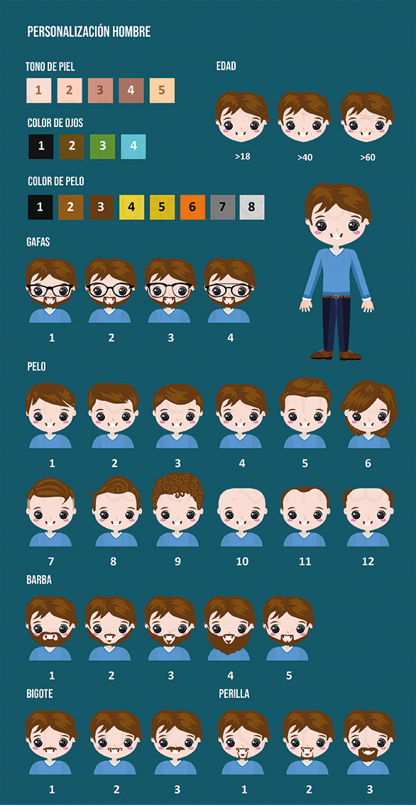 • Puedes personalizar el niño/niña, eligiendo el pelo, color de piel y chupete.